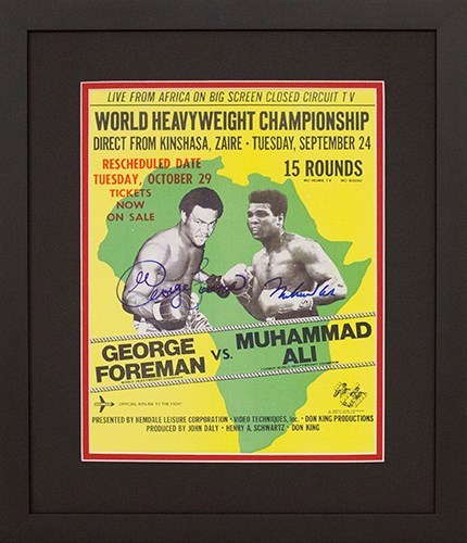 Muhammad Ali vs George Foreman Signed Official Boxing Championship “The Rumble In The Jungle” 11×17 Boxing Poster Muhammad Ali vs George Foreman – “The Rumble In The Jungle” – October 29, 1974 – 20th of May Stadium Kinshasa, Zaïre – Signed by: Muhammad Ali (d.6/3/16) and George Foreman Autographed Official Boxing Championship Fight Night Poster – Custom Framed (Includes Certificate of Authenticity and Officially Licensed Holograms)