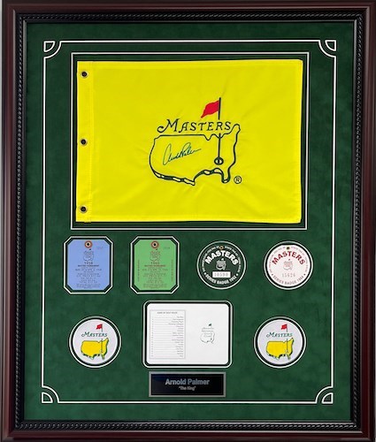 Arnold Palmer – (d. 9/25/2016) Custom Masters Flag Display With Masters Badges From All 4 of Mr. Palmers Masters Championships ***Extremely Limited*** – Custom Framed In Cherry Wood Frame With (4) Replica Official Masters Badges from All 4 of Mr. Palmer’s Masters Wins from 1958, 1960, 1962 and 1964 - (2) Official Masters Patches, (1) Augusta National Golf Club Masters Scorecard. This is a museum quality item. Autographed by: Arnold Palmer