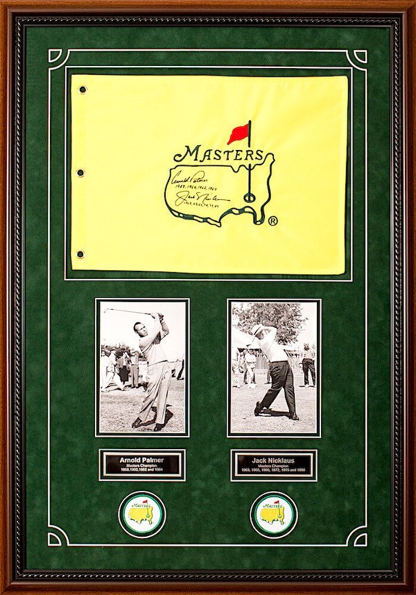 Arnold Palmer (d. 9/25/2016) and Jack Nicklaus – Masters Flag Autographed With Added Inscription Of Years They Won The Masters Championship – Extremely Rare – -Custom Framed In Cherry Wood Frame -With 2 Official Masters patches -(2) 5×7 Black and White Vintage Photos and custom nameplate This is a museum quality item and very rare as both Mr. Palmer and Mr. Nicklaus added the years they won the Masters Championship. Signed in the following manner “Arnold Palmer 1958, 1960, 1962, 1964” and “Jack Nicklaus 1963, 65, 66, 72, 75, 86”