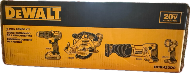 This DEWALT 20V MAX cordless tools combo kit includes two 20-volt lithium-ion batteries, 1 charging station, 1 compact drill/driver, 1 reciprocating saw, 1 circular saw and 1 LED work light as well as a contractor carry bag.