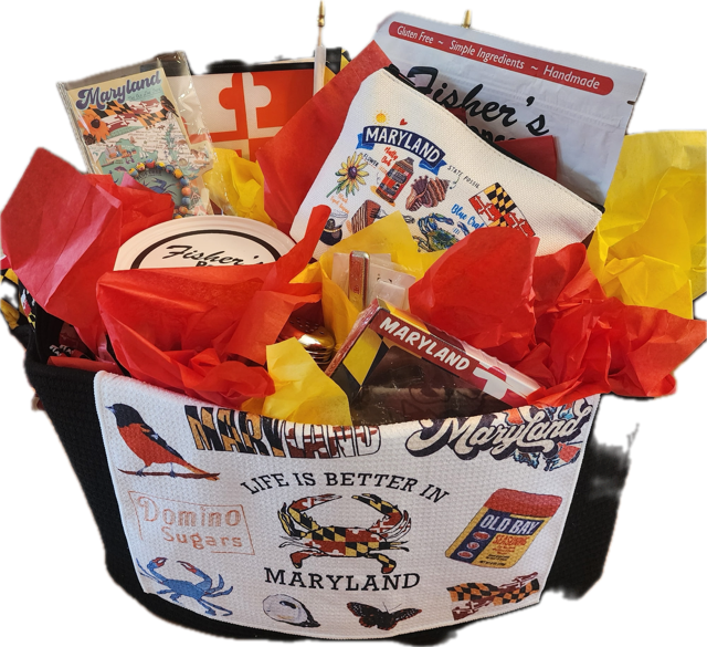 Maryland basket, filled with 6 pewter crab knives, old bay shaker, 2 bottles St. Michaels wine, 6 pack and 4 pack of local craft beer, 2 Md drink tumblers, 1 tub and 1 bag of Fisher's popcorn, MD blanket and beach towel, MD wooden sign, MD wood cutting board, puzzle, koozie, make up bag, chocolate crab, 2 decks of cards, Md bracelet, socks, stuffed crab, MD garden flag, t towel, Md wine glasses, MD decals, MD tote, Basket