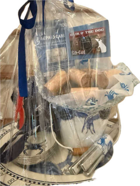This crab feast on a platter was provided by the SSPP Men's Soccer team and contains all the necessary accouterment for a fabulous party. Included is a $100 Visa gift card to be used toward the purchase of crabs from your favorite local crab shack, a classic Golden Rabbit enamelware platter, bucket, and 6 tasting bowls; a crab apron, 4 pewter crab knives, 6 mallets, and a crab claw bottle opener to compliment the $25 gift card to Hair O'The Dog liquor store to select the perfect beverage to match the buyer's personal taste.