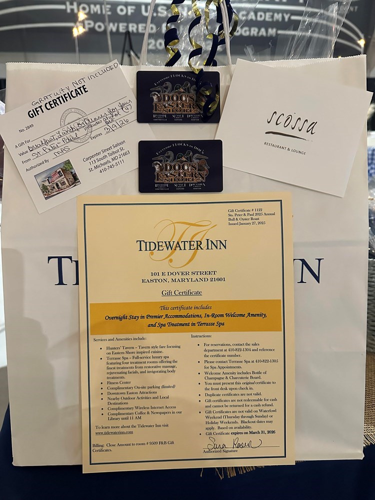 Enjoy a 1-night stay at the Tidewater Inn with In-Room Welcome Amenity (Bottle of Champagne & Charcuterie Board) and Spa Treatment in Terrasse Spa ($450), $50 Gift Card to Scossa Restaurant, $200 Carpenter Street Saloon Gift Card (Breakfast, Lunch or Dinner for 4 with Alcohol) ** Gratuity is NOT Included **, and $100 Gift Card Doc's Eastern Shore Restaurant.