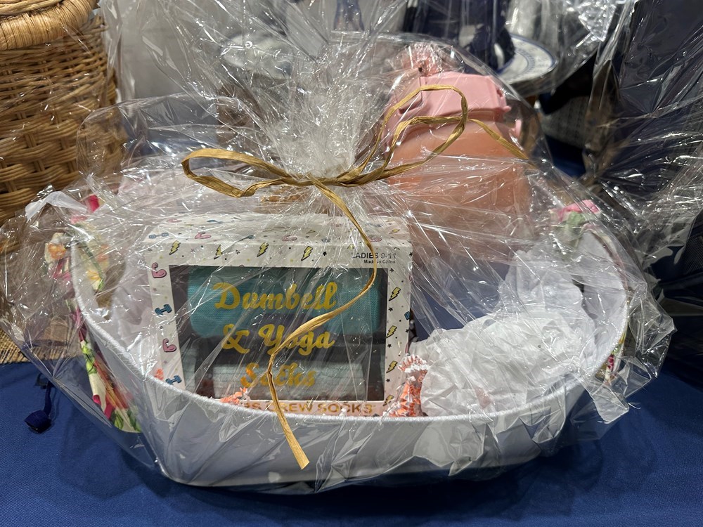 Enjoy this cute auction basket filled with fun gym necessities: water bottle, Balla weights, little bag and socks set.
