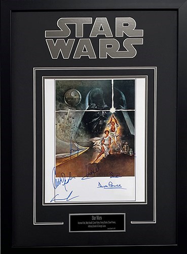Limited Edition – “Star Wars” (1977 Original Movie New Hope) – (6 Autographs) – ***Extremely Rare Item*** – Limited Edition and Individually Numbered to Only 15 Worldwide. Custom Framed With “Star Wars” Logo Double Laser-Cut In The Matting of The Frame. – Museum Quality – Signed by: Mark Hamill (Luke Skywalker), Harrison Ford (Han Solo), Carrie Fisher (d. 12/27/2016) (Princess Leia), David Prowse (d. 11/28/2020) (Darth Vader), Kenny Baker (d. 8/13/2016 (R2-D2) and George Lucas (Director)